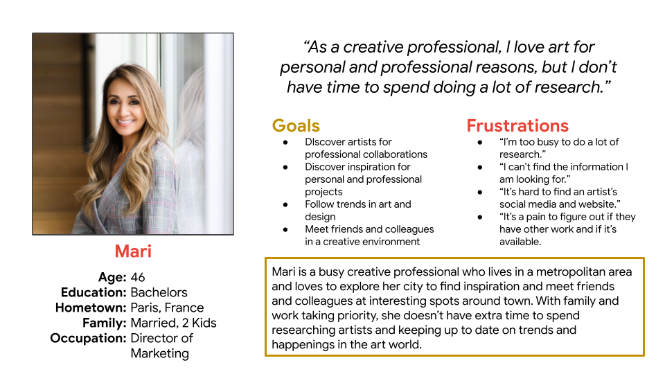 Created as part of the Google UX Design Professional Certification course, the Art Lover app is designed to give gallery visitors and creative professionals a way to discover artists, read artist biographies, and save their favorites to a collection. Scroll down to learn more about my process.